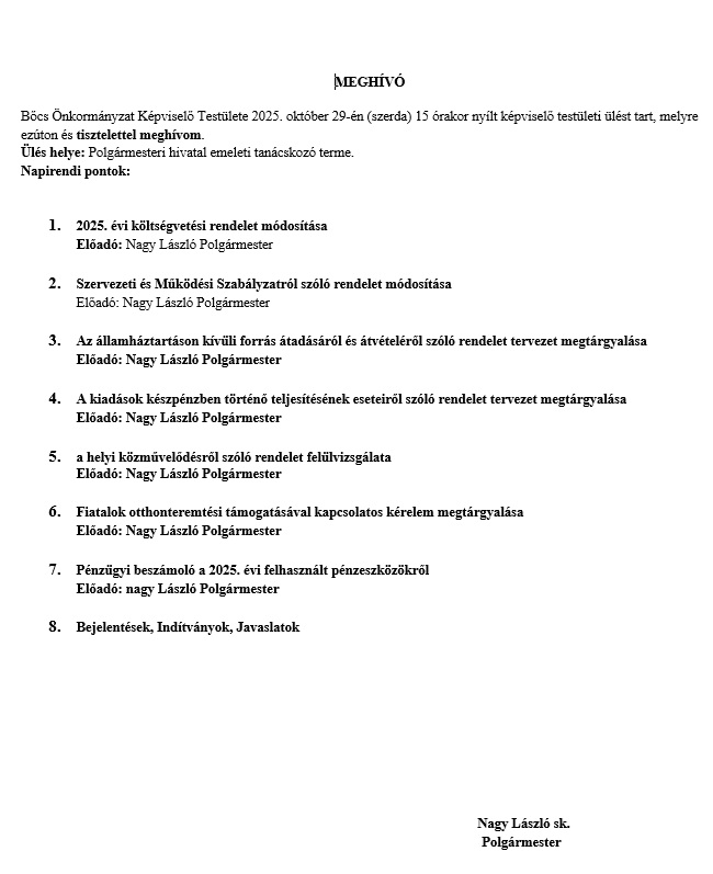 2025. október 29-én 15.00-kor ülésezik Bőcs Község képviselőtetülete.