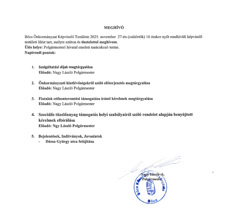 Meghívó Képviselő-testületi ülésre, 2025. november 27-én 16-kor, a Polgármesteri Hivatal emeleti tanácskozó teremébe.